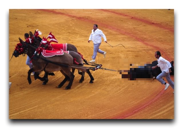それから、3頭の馬がやってきて、絶命した牛の角に鎖をつけ、会場を引きずっていった。